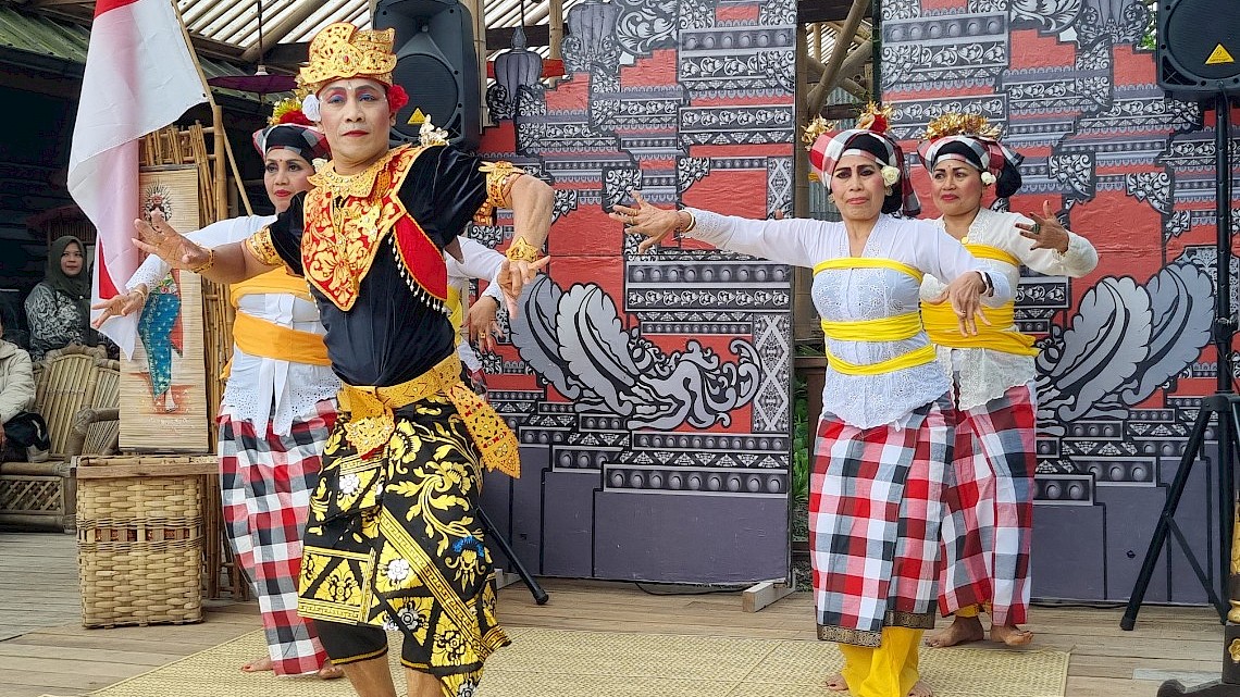 15:00 Joged Bumbung: Een vrolijke en interactieve dans op het ritme van bamboemuziek. Het draait om plezier en verbinding, waarbij de danseres toeschouwers uitnodigt om op een speelse manier samen te dansen.