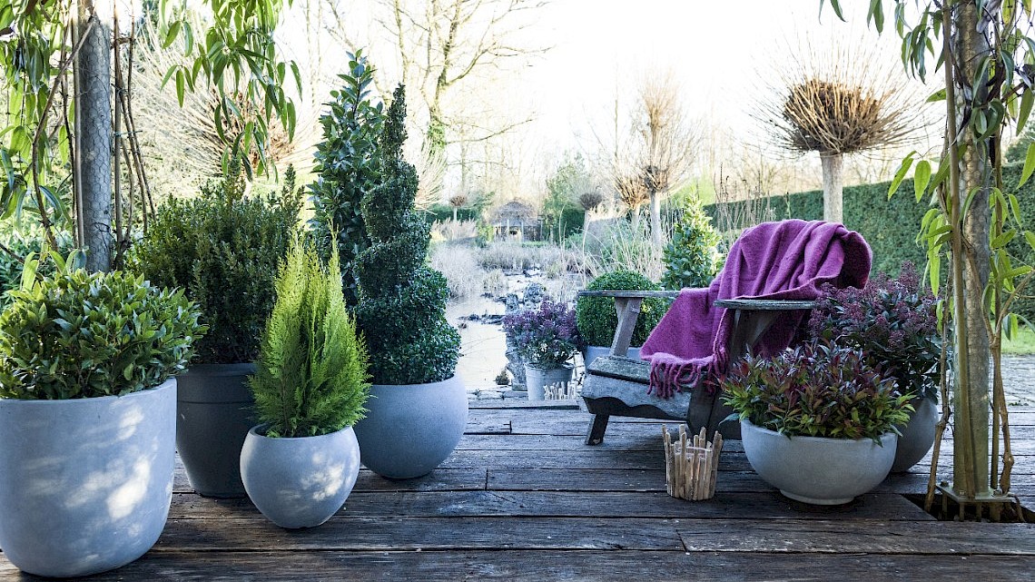 Tuinplanten die permanent groen zijn vormen de basis van een winterse pottenborder. Denk daarbij aan coniferen, Buxus, druifheide (Leucothoe) en schijnhulst (Osmanthus). Door een mix te maken van verschillende hoogten, bladvormen en -kleuren creëer je al snel een goede startsituatie om met diverse winterbloeiers kleur toe te voegen. Een groenblijver als conifeer is tijdens de donkere maanden ideaal om te voorzien van LED-verlichting: een alternatieve kerstboom. Of hang er pindaslingers in als verwennerij voor vogels.