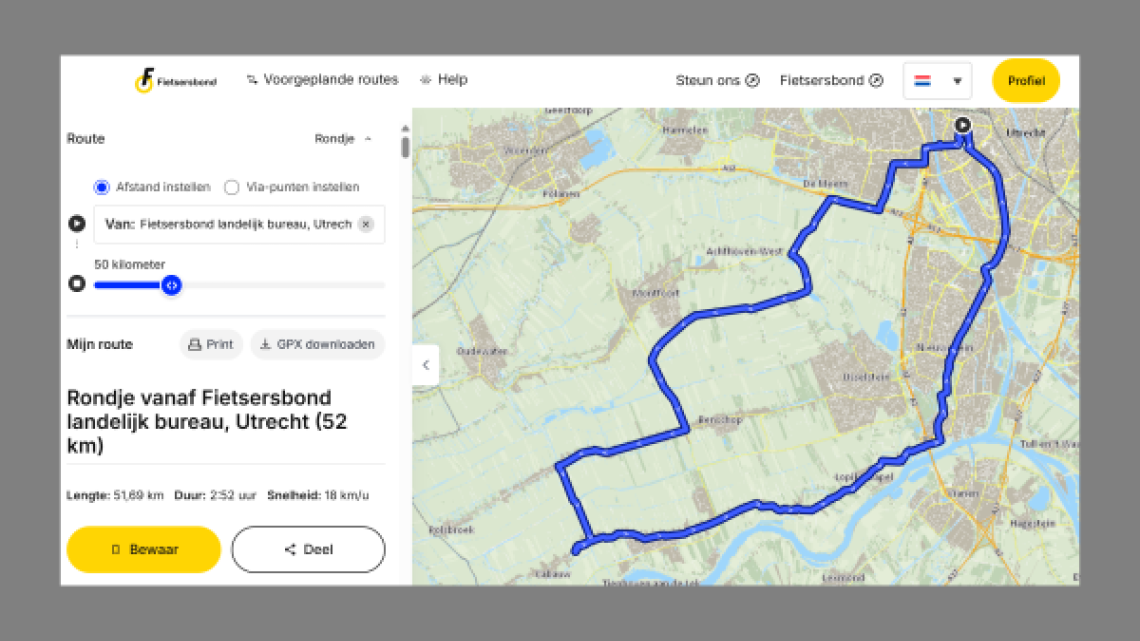 De Fietsersbond lanceert de vernieuwde Routeplanner: de meest complete fietsrouteplanner van Nederland. Op de website plan je eenvoudig een route die bij je past, of je nu de kortste weg, een autoluwe route of een recreatief rondje zoekt. Vrijwilligers van de Fietsersbond zorgen voor actuele informatie over fietspaden, zoals de breedte, bankjes langs de route en wegopbrekingen. Kortom: een planner gemaakt door fietsers, voor fietsers.