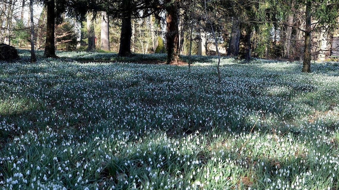 In de tuinen en tussen de bomen, aangelegd in sfeervolle Engelse landschapsstijl - hebben duizenden sneeuwklokjes en winterakonieten hun kopjes al opgestoken. Via een zorgvuldig uitgezette wandelroute ontdek je de mooiste plekken van het landgoed, badend in het vroege lentelicht.